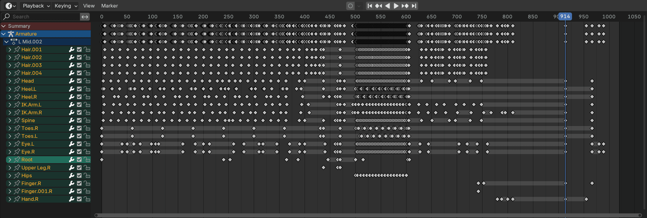 An overview of all keyframes driving the character’s motion throughout the sequence, emphasizing that every movement was hand-animated.