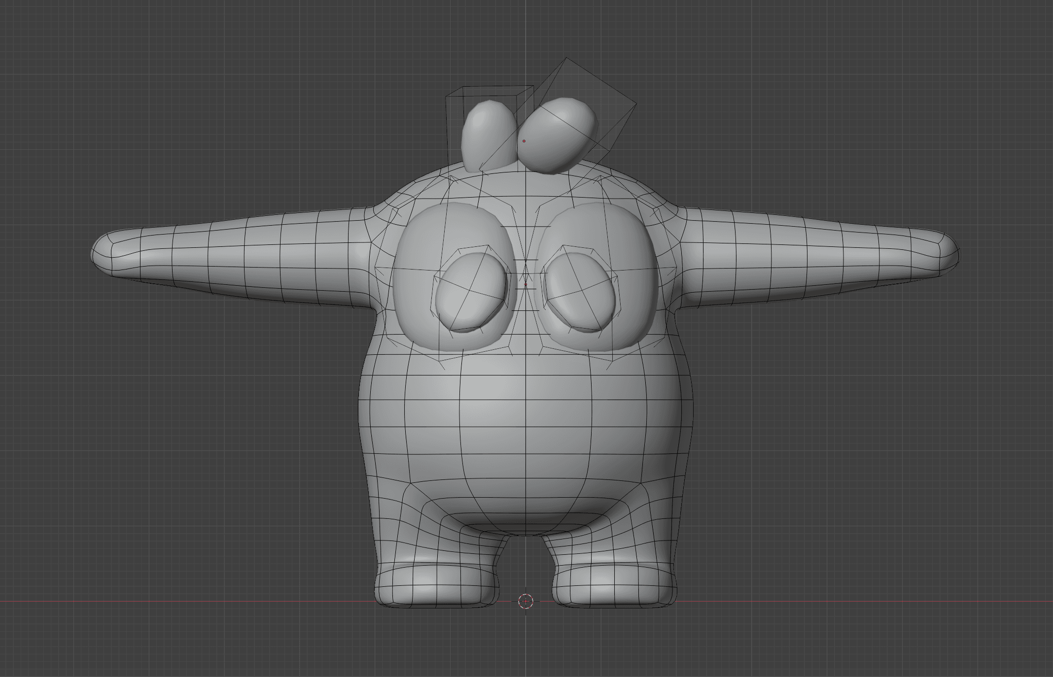 The character seen from the front with wireframe enabled, showing clean topology optimized for deformation and smooth animation.