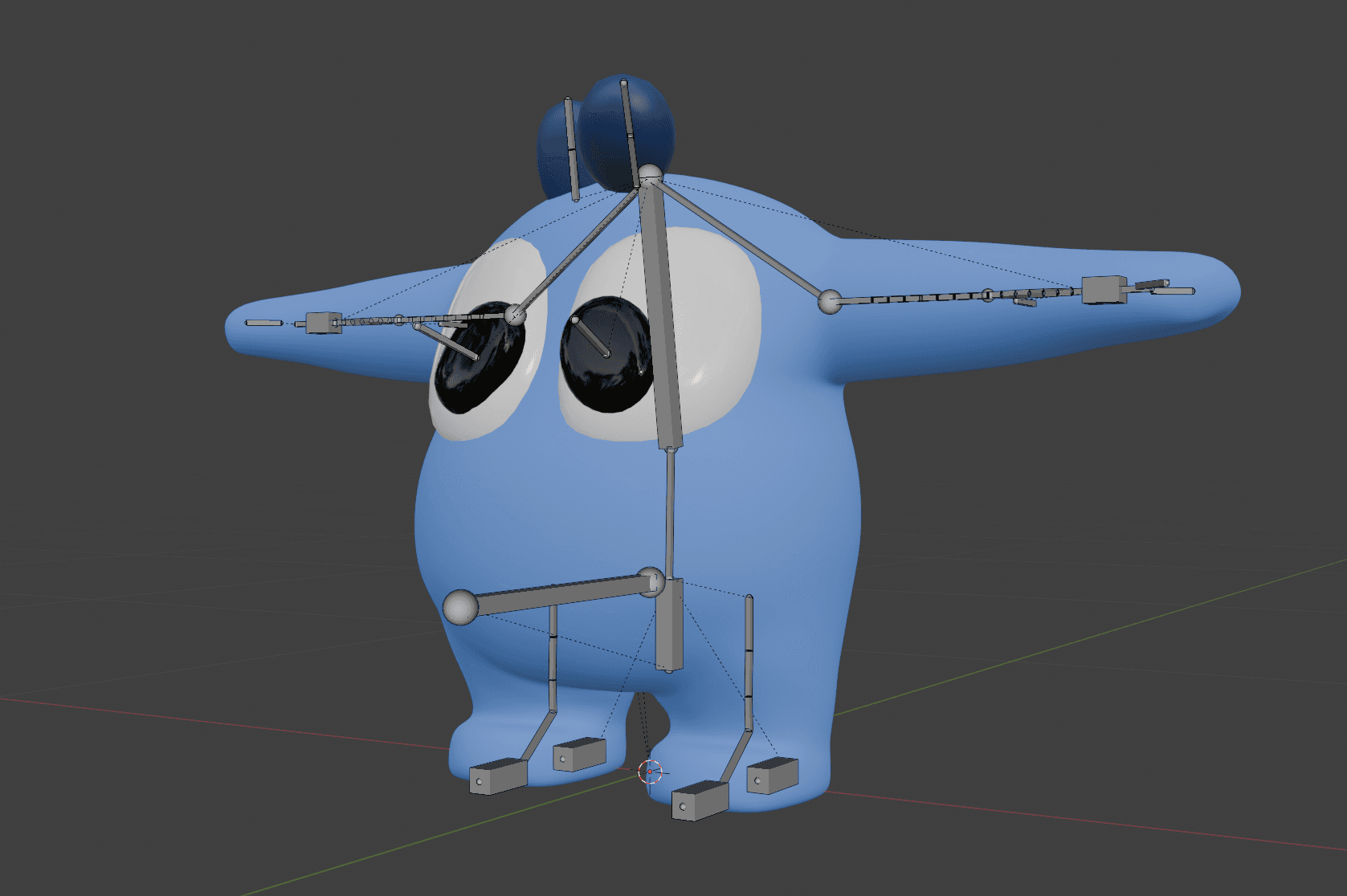I designed, modeled, rigged, and animated the entire character in Blender. The character walks, runs, expresses emotion, and interacts with objects: first kicking a small ball, then approaching a large cube and poking it, causing the cube to levitate, change color, and shake in response. The model was built with clean topology to deform smoothly, and the rig was carefully weight-painted to maintain natural movement despite the stylized proportions.