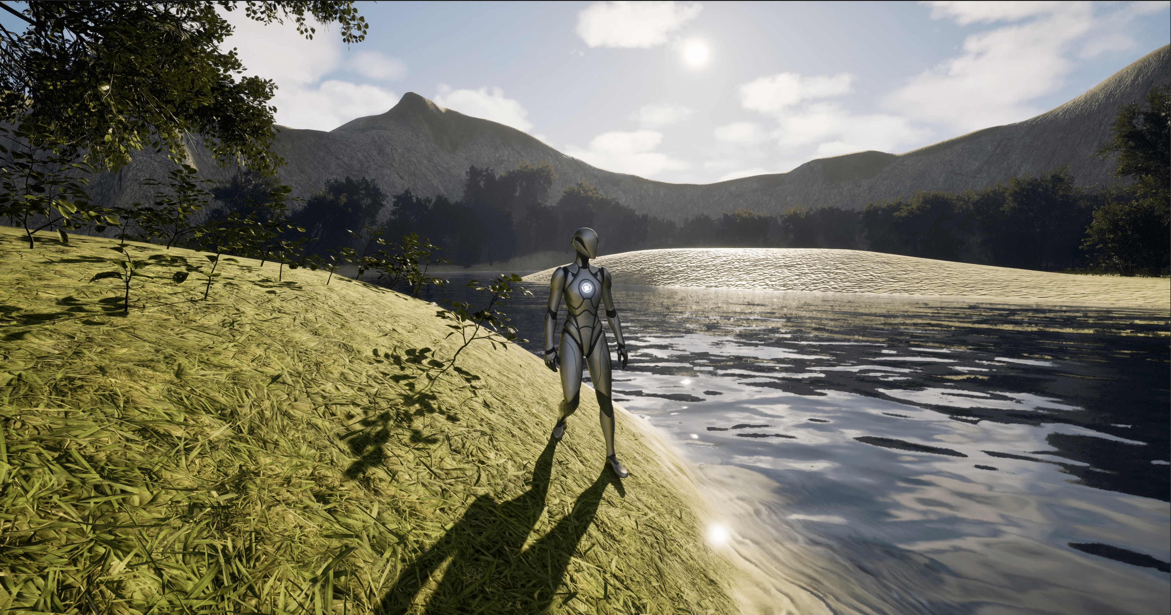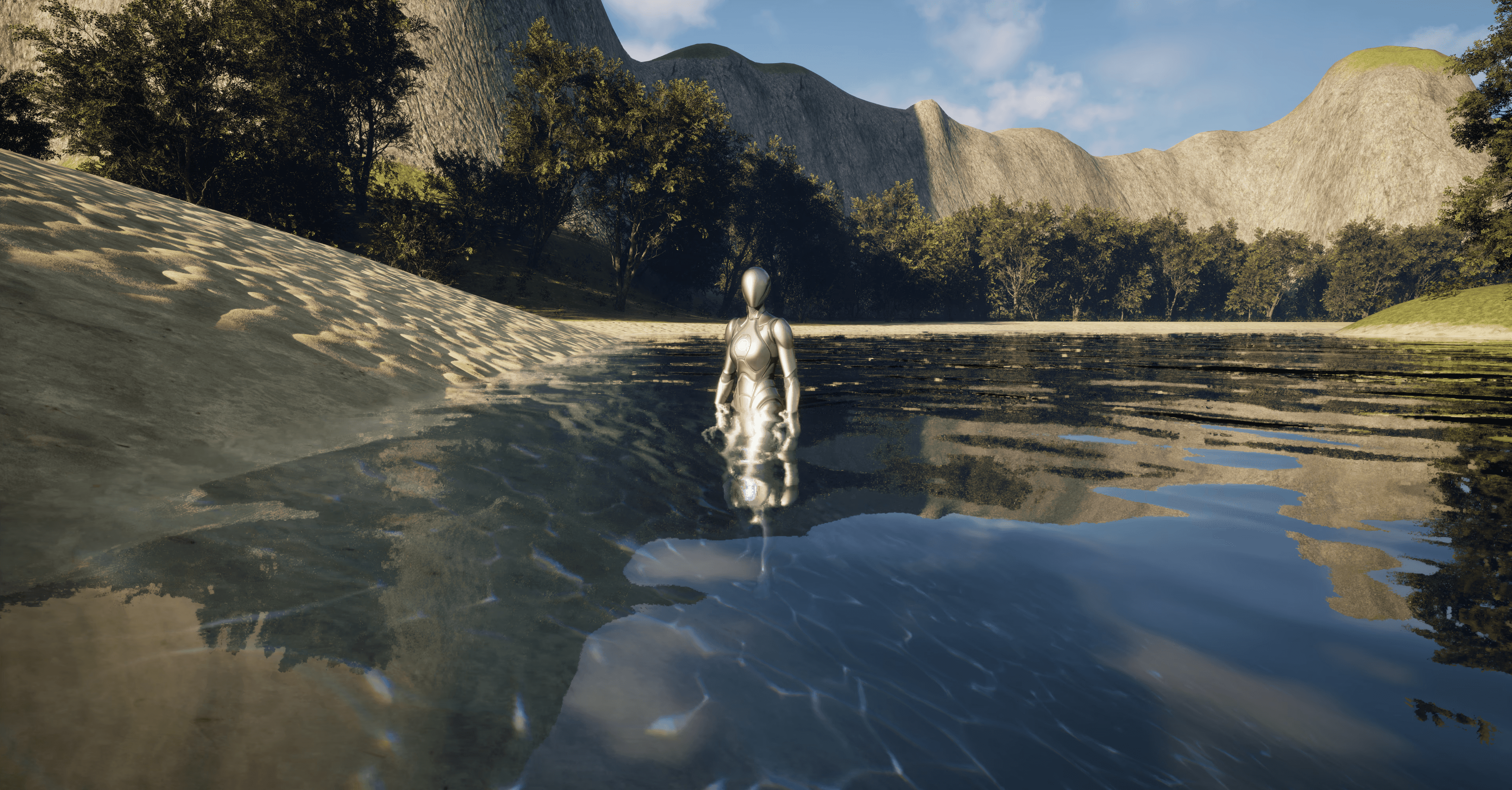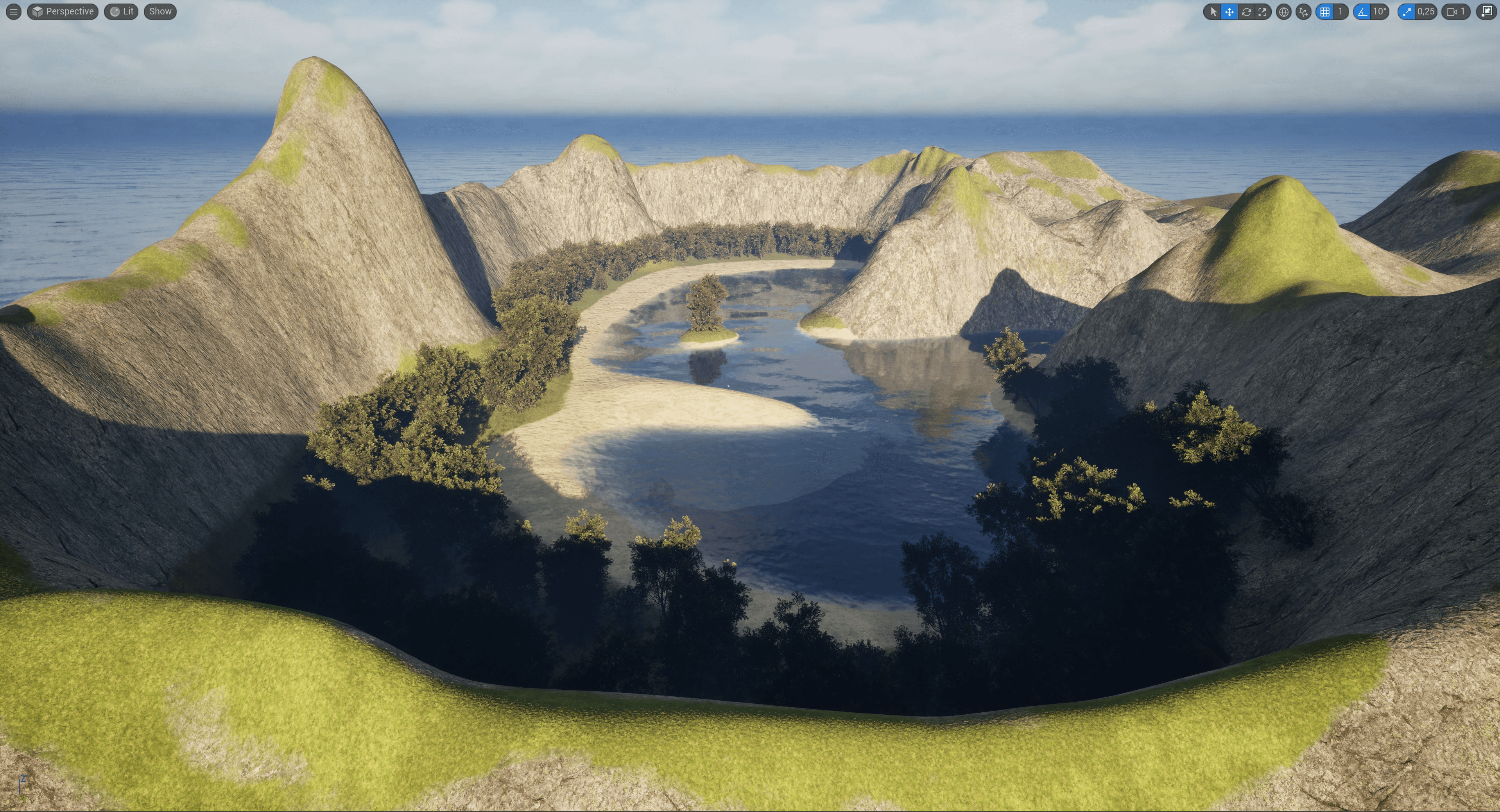 An overview of the complete level, combining the water shader with terrain, vegetation, and lighting. The composition tests how the shader integrates visually within a larger natural environment.