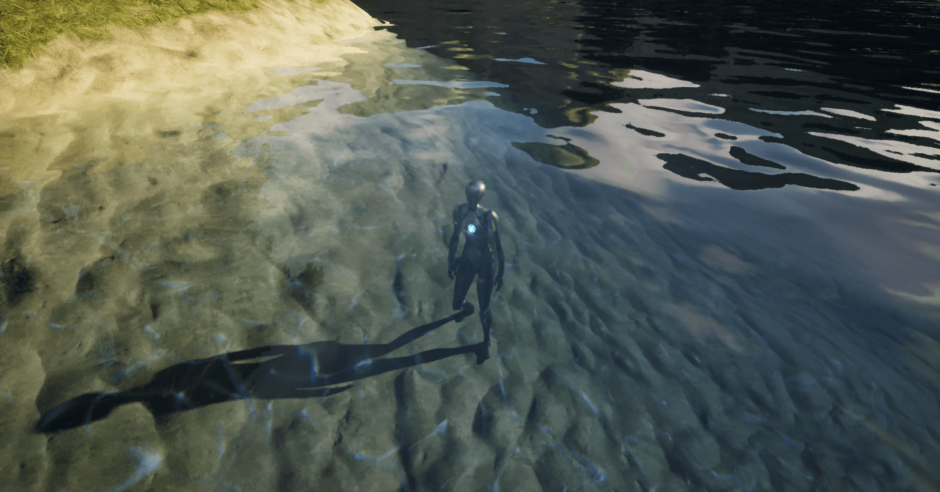 Animated caustics are projected through a decal actor that follows the same movement as the surface waves. In addition, I built a master material blending sand, stone, and grass textures, allowing the environment to be painted using a single material instance. All shaders were created through UE5’s material graphs.